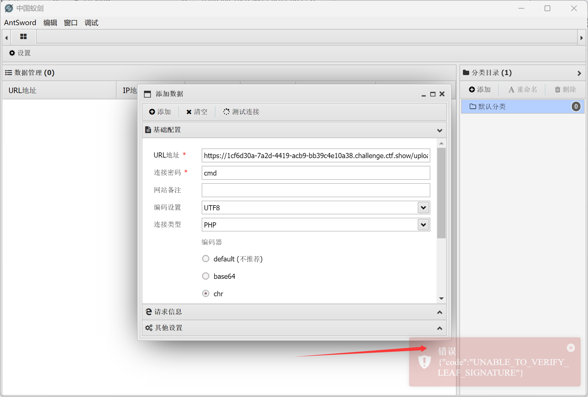 (这里有个很值得注意的点:如果出现这种报错,他的意思是无法验证叶子签名。简单来说,是因为题目环境使用的是 HTTPS 协议,但是它的 SSL 证书是自签名的或者不被信任的(CTF 题目环境经常这样)。蚁剑出于安全考虑,默认拒绝连接这种“不安全”的 HTTPS 链接,所以报错了)