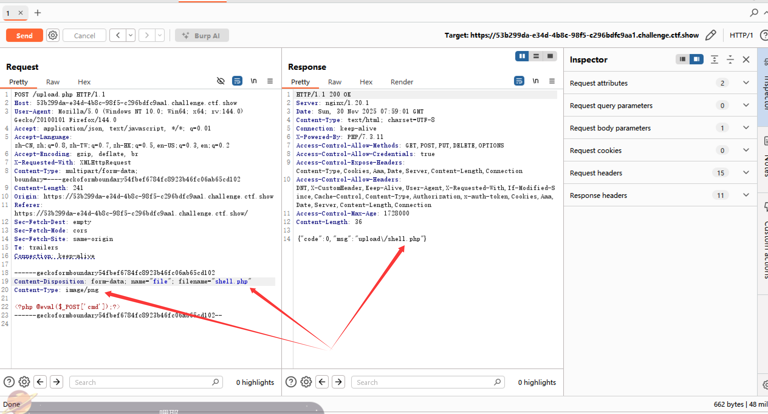 因为前端卡的特别死,只允许上传.png。所以我们先上传.png再抓包修改为.user.ini,再send回去。