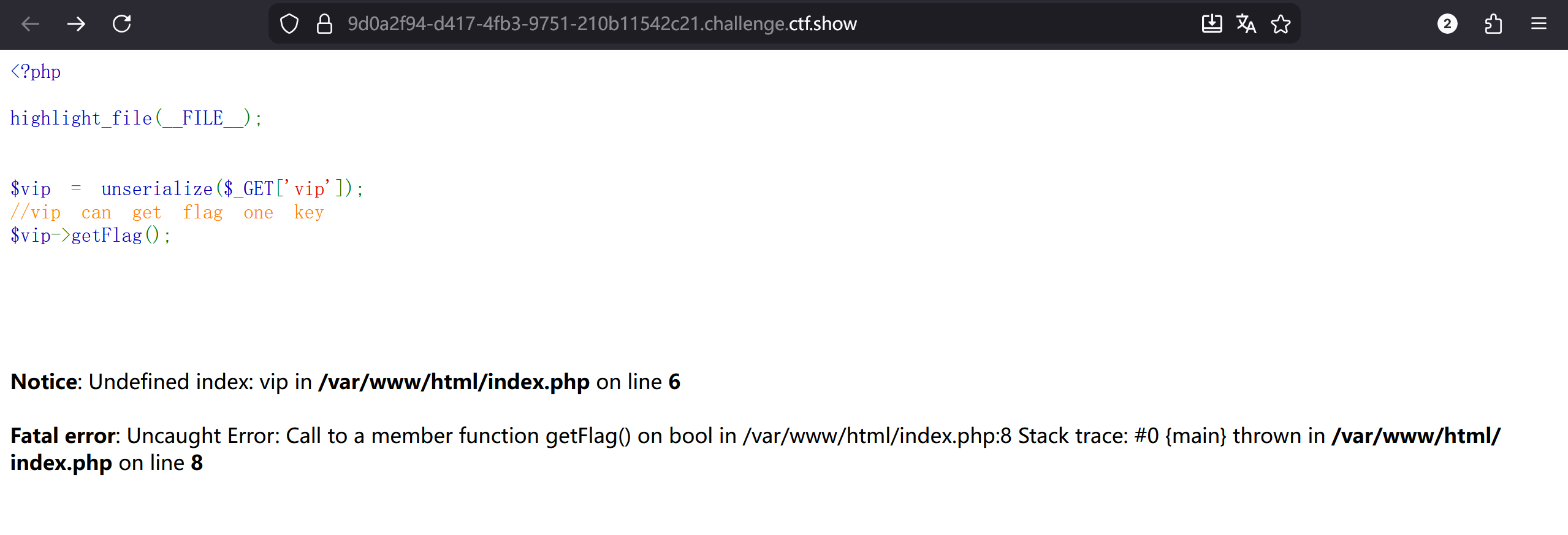 直接对$vip变量进行反序列化,然后执行$vip->getFlag(),但是根本没有看到这个方法,