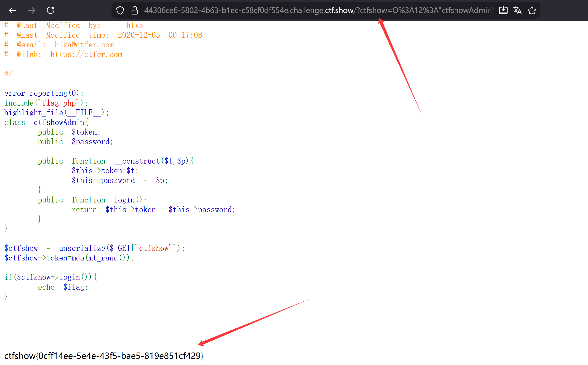 从 URL 的 GET 参数 ctfshow 中读取字符串,并通过反序列化将其还原成一个 ctfshowAdmin 对象,但是存在$ctfshow->token=md5(mt_rand());使得$token完全随机