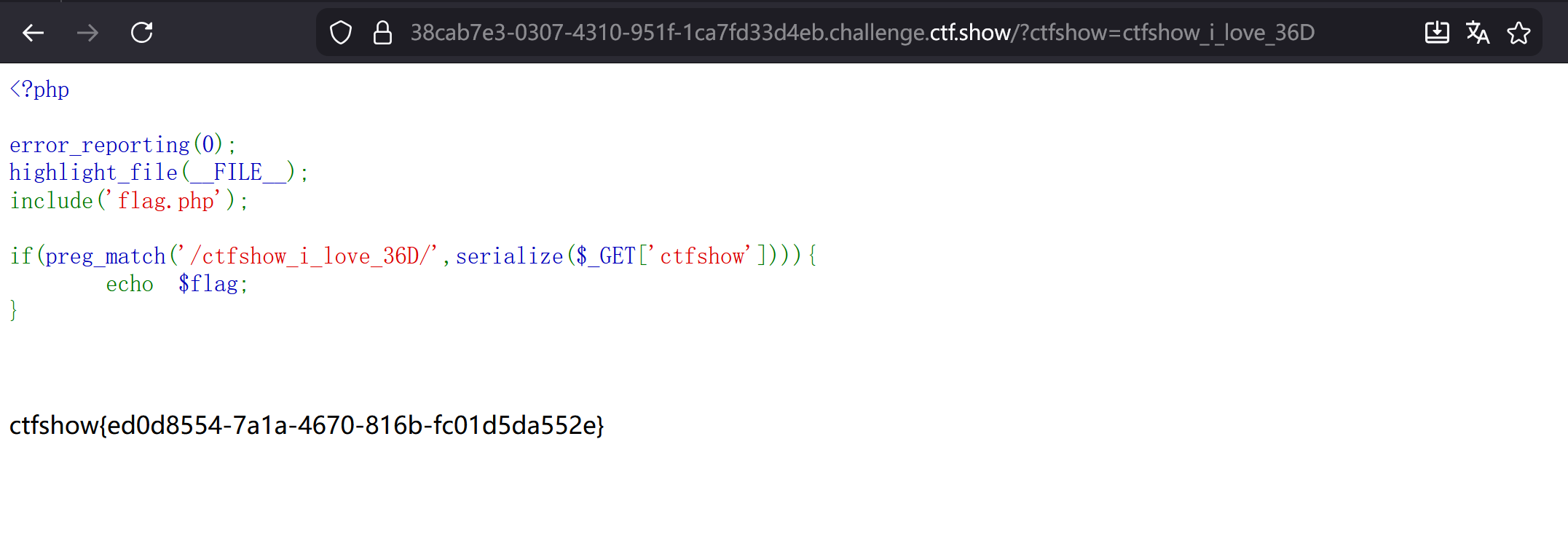 GET传参并对其进行序列化,出现ctfshow_i_love_36D就给出flag