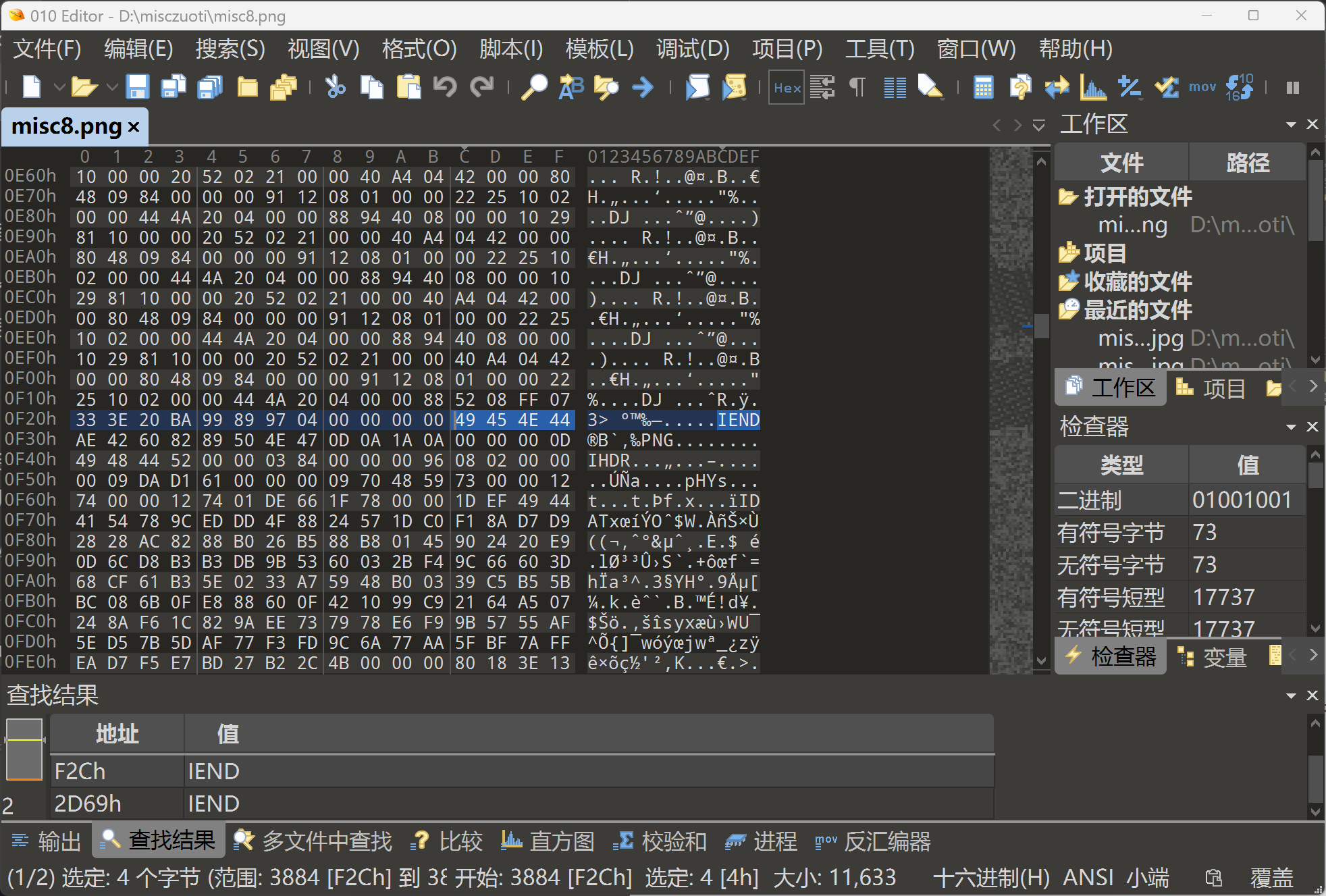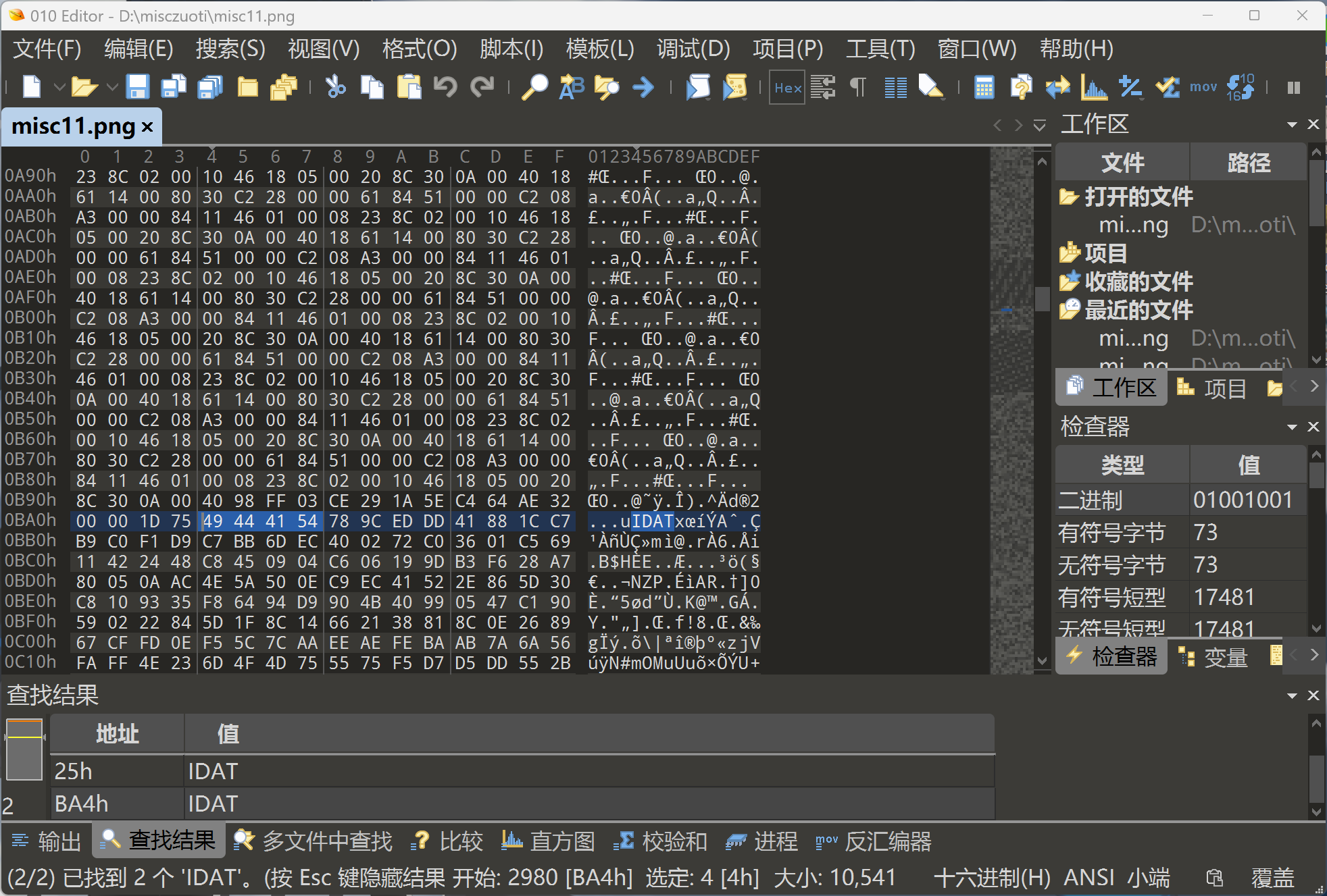 上文提到⬆png的格式,包括IDAT,我们在010里面一搜,就会发现,这一张图片里面有两个IDAT