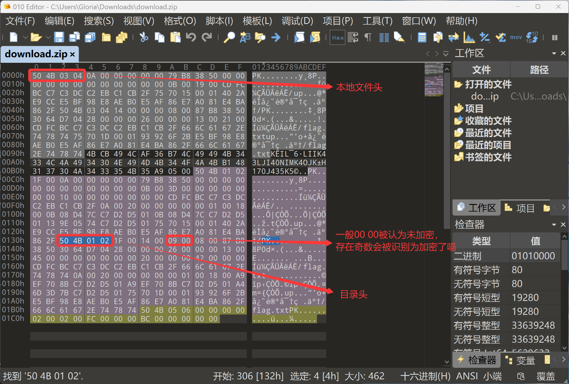 而目录里加密标志在找到50 4B 01 02之后,往后数第9和第10个字节是加密标志,没加密就是00 00,加密或者伪加密就是09 00或者 01 00(只要第一个字节是奇数,就会认为是加密了)