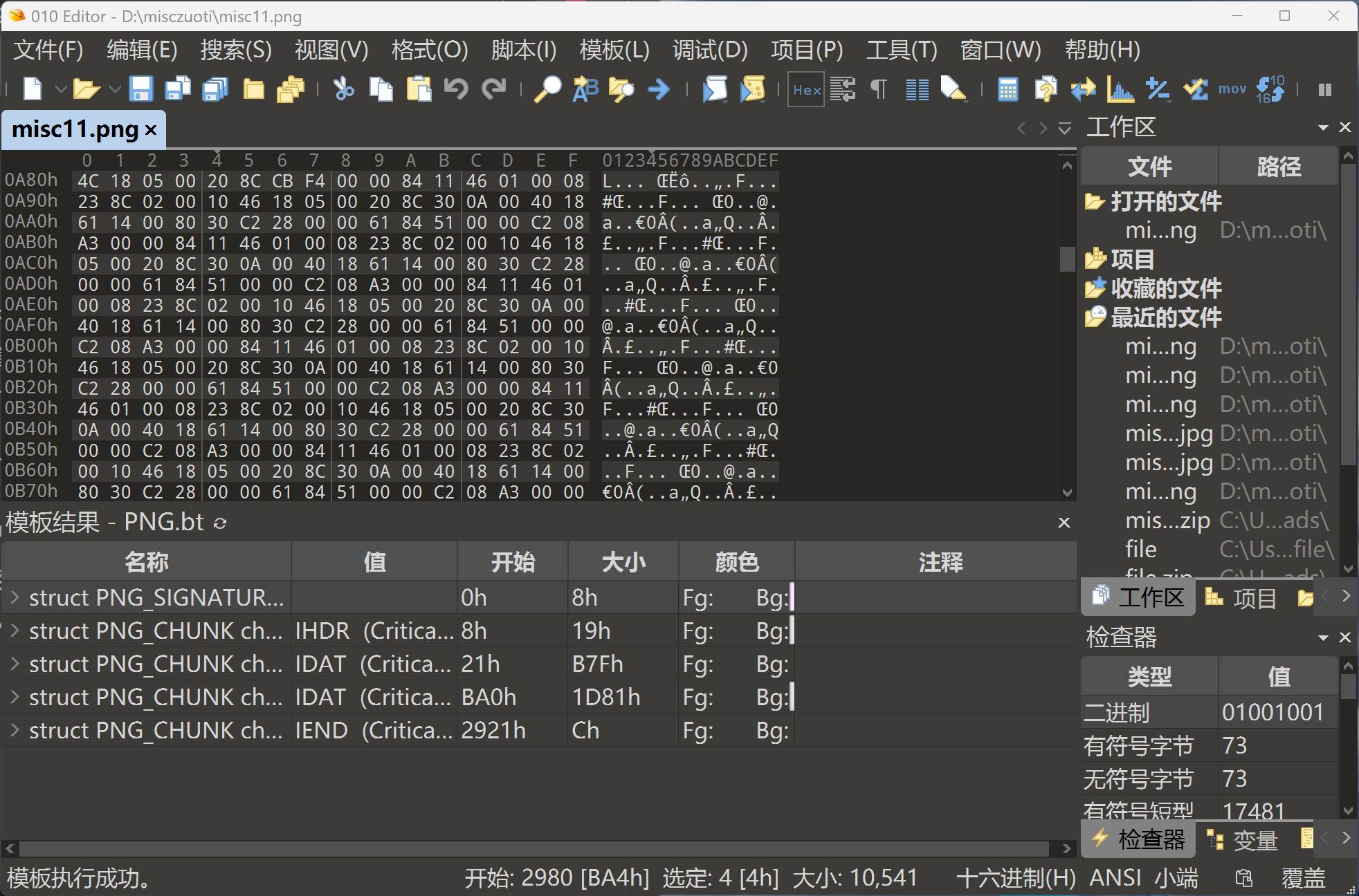这里我们先按F5运行png模板喵,如果没有png模板的话先下载一个(点击模板➡模板储存库➡搜索PNG.bt➡install)