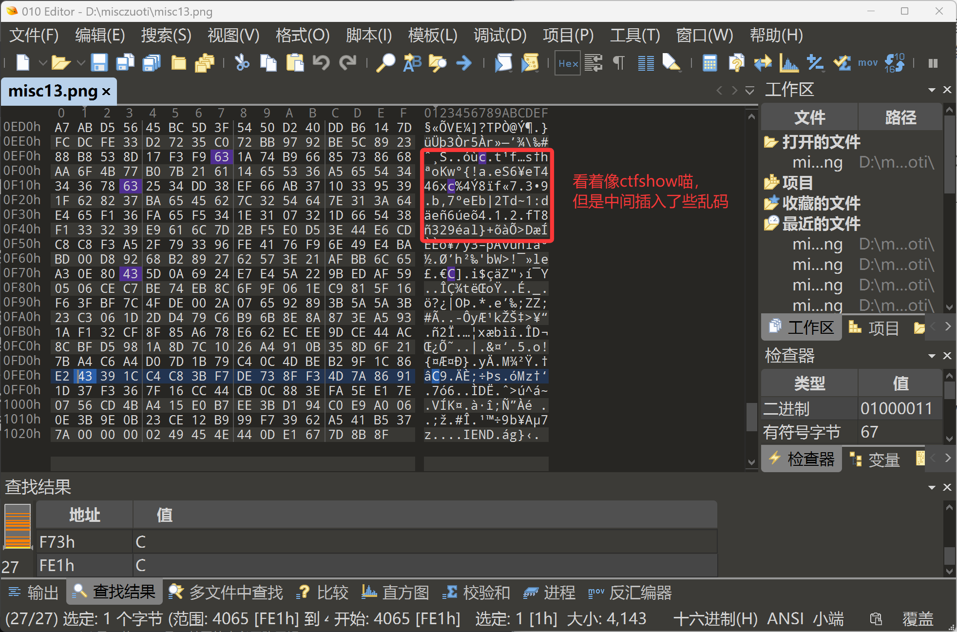 png图片的正常结尾标志通常是**IEND(对应十六进制为AE 42 60 82)**如果在它后面还有一堆乱七八糟的字符,那就是出题人搞的鬼喵!