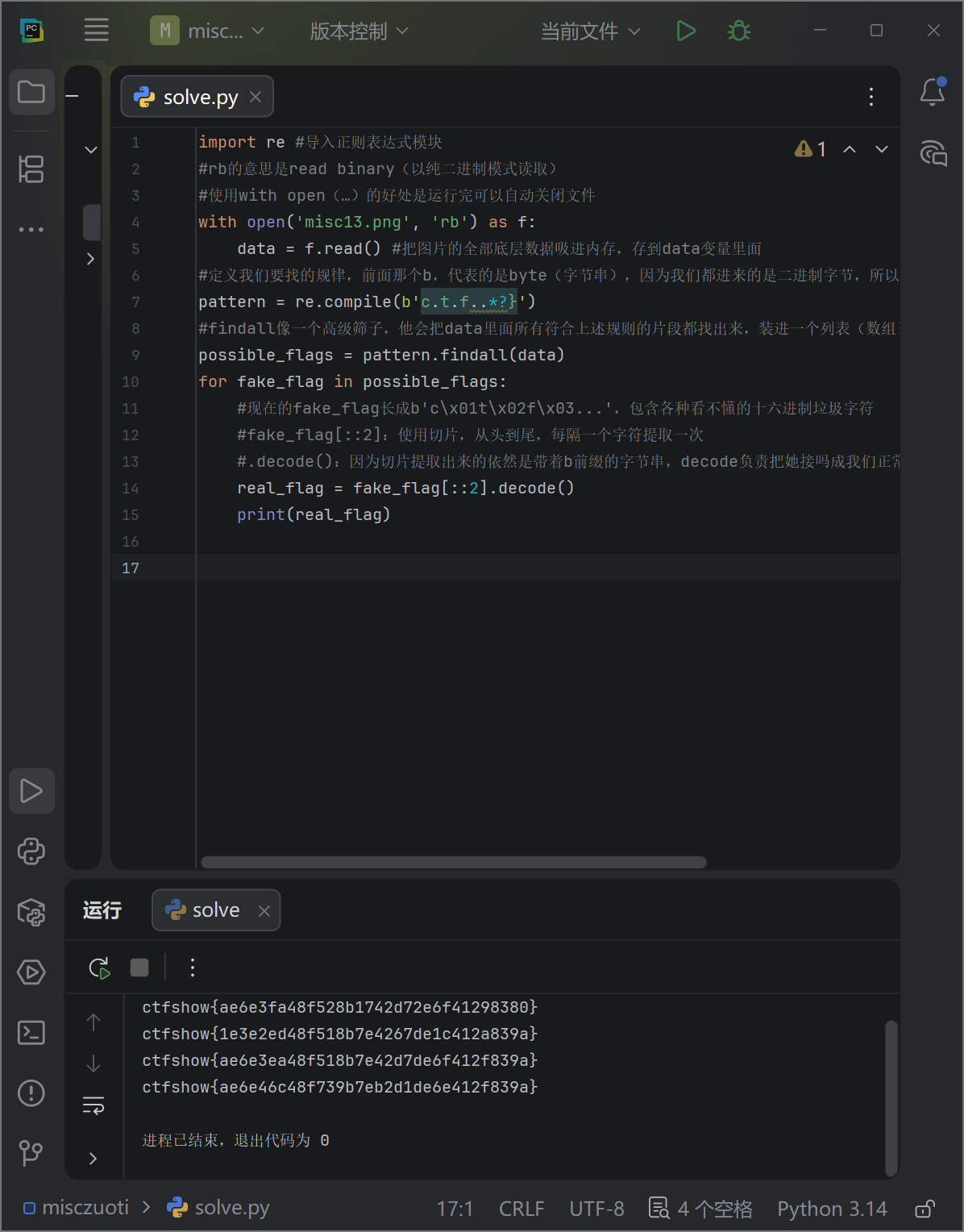 重复上一题操作,挨个删除IDAT,直到出现flag为止(这里在010里面操作时,记得删除一个IDAT就重新运行一下png模板,不然会报错)