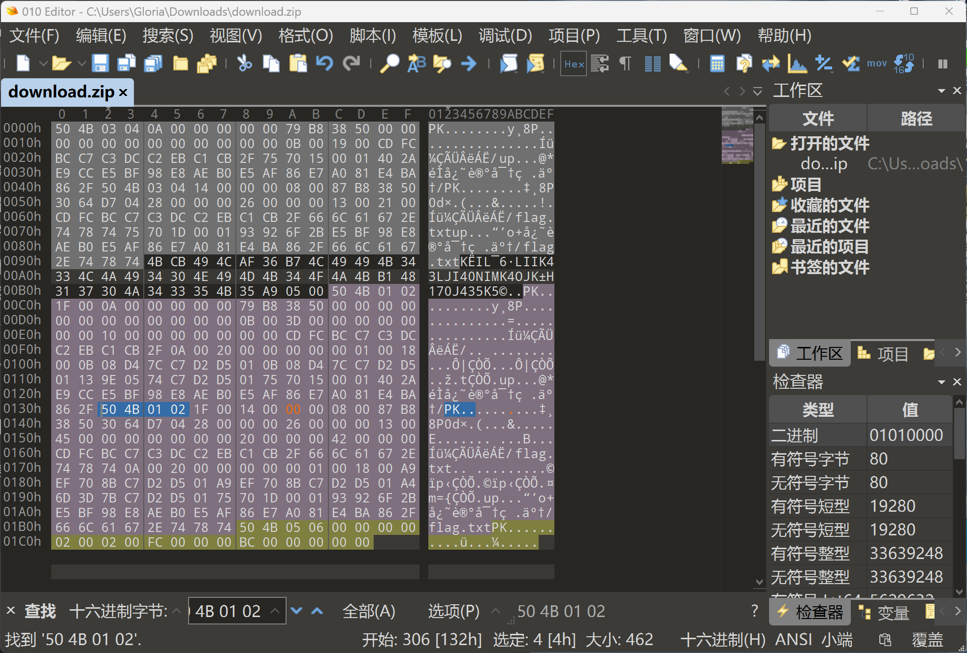 如果压缩包里只有一个文件,那么结尾就只有一个50 4B 01 02,如果有两个文件(或者1个文件夹+1个文件),结尾就会有两个50 4B 01 02,以此类推即可