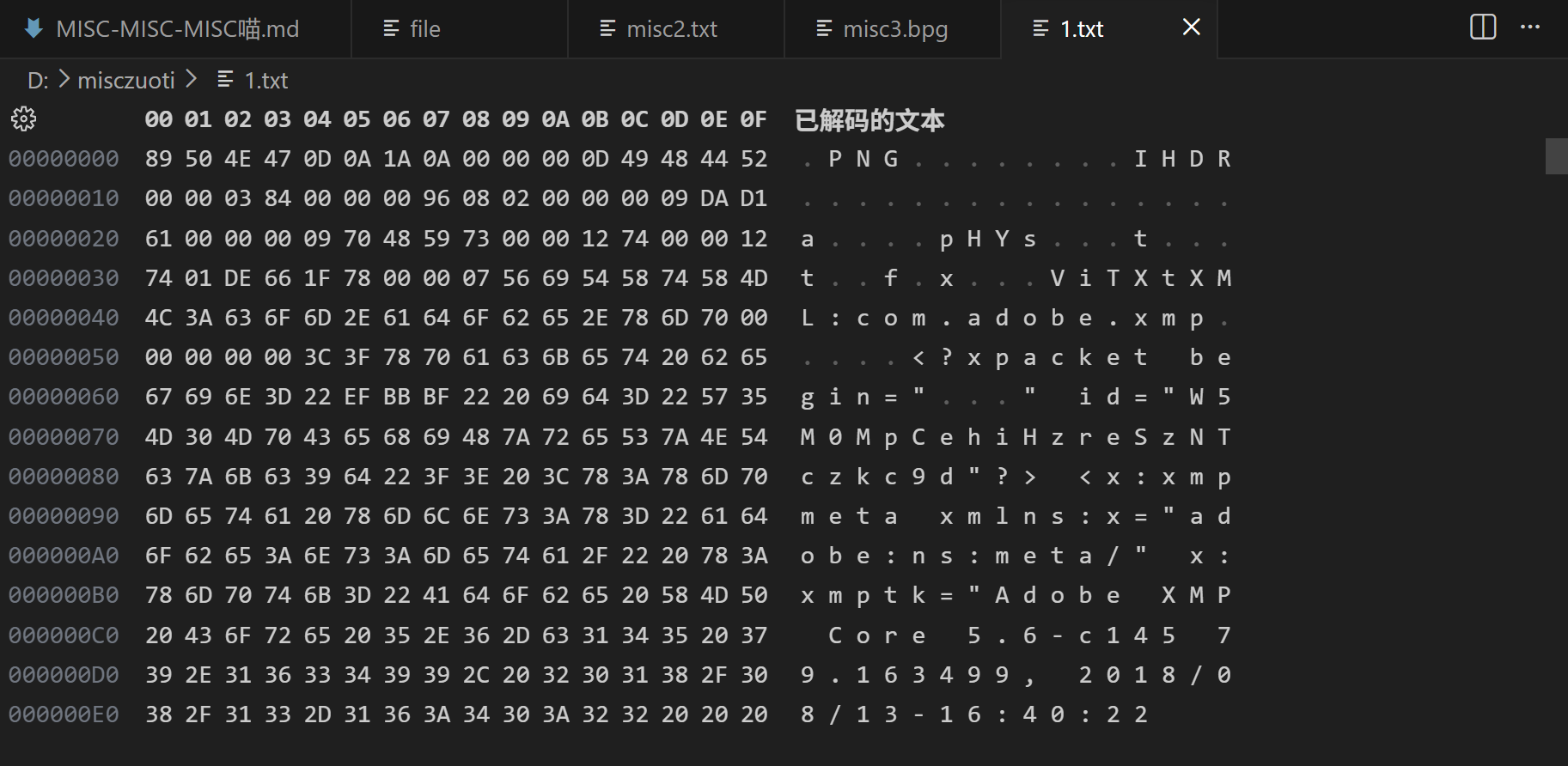 打开之后呢,全是乱码,所以我们考虑去vscode打开,然后发现这其实是一张.png